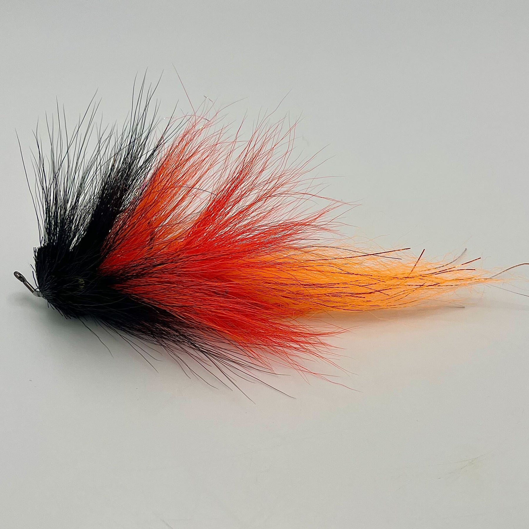 Tied and designed by Musky Fool’s Tim O’Connor, the Rizzler is a weighted, articulated bulkhead fly.  The Rizzler is designed to get down deeper than your traditional Buford or bulkhead fly, while maintaining the action we like in these unweighted patterns.  Often, a river pig is used for deeper presentations, but a river pig falls head first.  The Rizzler falls more level and kicks side-to-side on the strip, offering more versatility in weighted fly presentations.  This is also a great fly to get down deeper without having to switch to a faster sinking line, saving time between presentation changes.  The rear shank comes with a solid welded ring(#5) attached, split ring on a rear hook if desired!