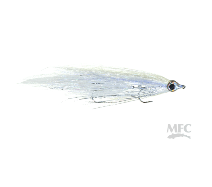 A translucent baitfish imitation that big fish can’t resist. Tied sparsely with UV polar chenille, ice dub shimmer fringe, and ghost flash; this thing looks just like a juvenile baitfish when it gets wet.