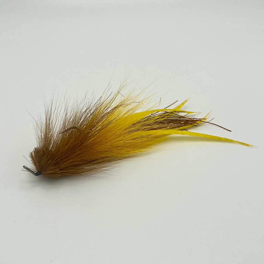 Tied and designed by Musky Fool’s Tim O’Connor, the Rizzler is a weighted, articulated bulkhead fly. The Rizzler is designed to get down deeper than your traditional Buford or bulkhead fly, while maintaining the action we like in these unweighted patterns. Often, a river pig is used for deeper presentations, but a river pig falls head first. The Rizzler falls more level and kicks side-to-side on the strip, offering more versatility in weighted fly presentations. This is also a great fly to get down deeper without having to switch to a faster sinking line, saving time between presentation changes. The rear shank comes with a solid welded ring(#5) attached, split ring on a rear hook if desired!