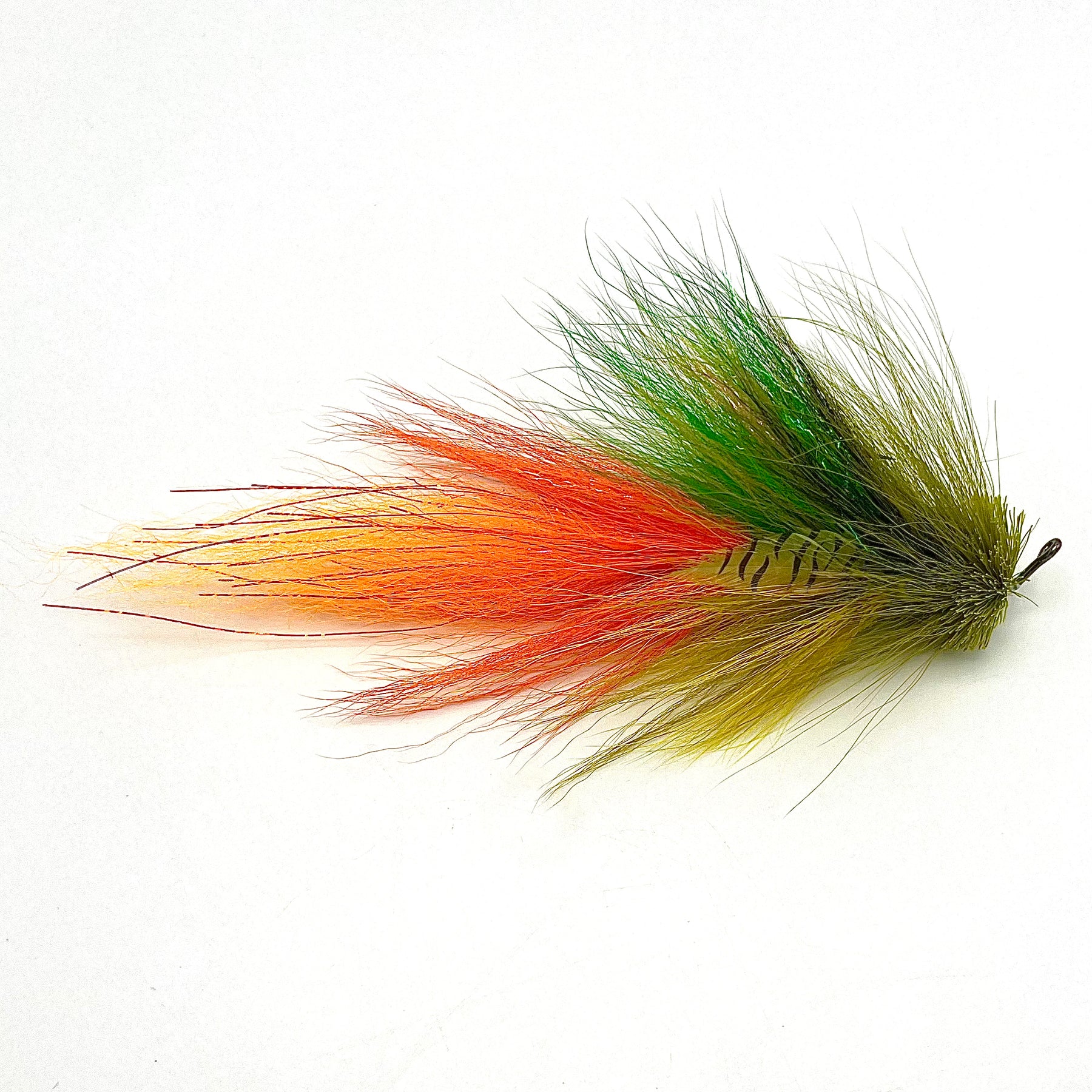 Tied and designed by Musky Fool’s Tim O’Connor, the Rizzler is a weighted, articulated bulkhead fly. The Rizzler is designed to get down deeper than your traditional Buford or bulkhead fly, while maintaining the action we like in these unweighted patterns. Often, a river pig is used for deeper presentations, but a river pig falls head first. The Rizzler falls more level and kicks side-to-side on the strip, offering more versatility in weighted fly presentations. This is also a great fly to get down deeper without having to switch to a faster sinking line, saving time between presentation changes. The rear shank comes with a solid welded ring(#5) attached, split ring on a rear hook if desired!