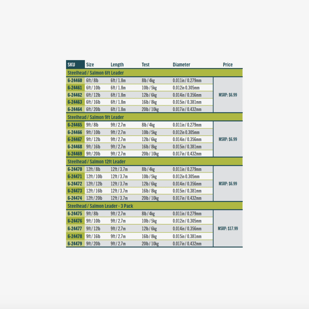 A medium-stiff, nylon tapered leader designed for the steelhead, salmon fly fisher, and ideal for all Spey rods and lines.