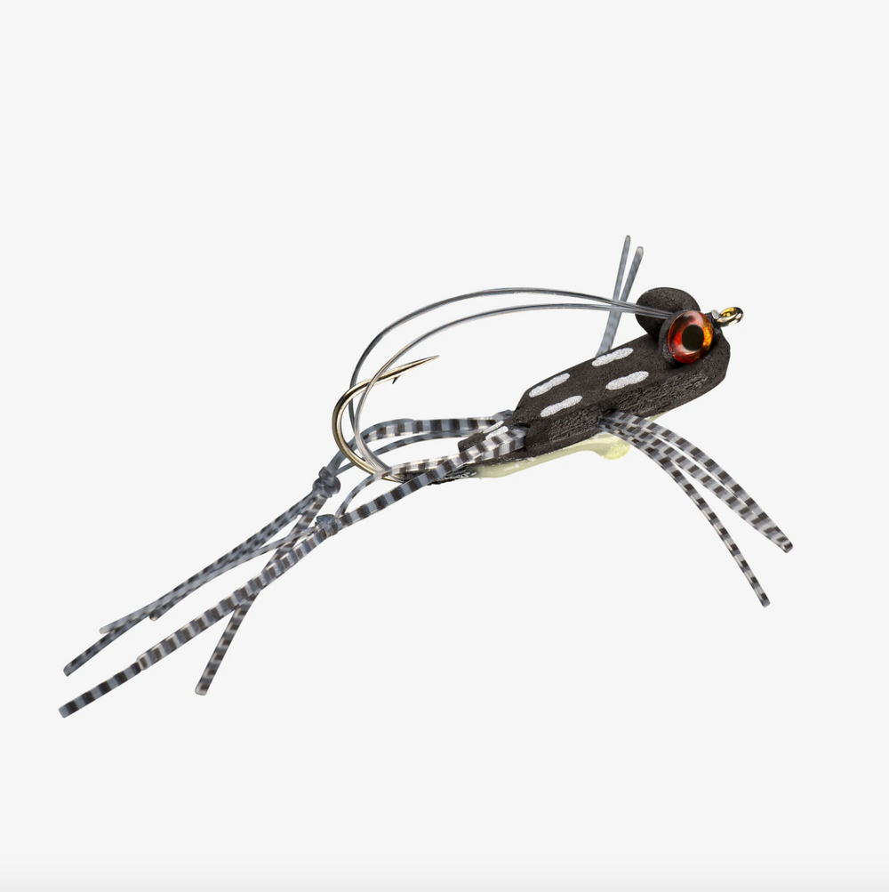 A killer topwater frog pattern for bass. The frog sits with it's legs and backside down in the water, and it's head and eyes out, giving it a very realistic appearance. It has been designed to rollover if it lands upside-down so that the hook point is always up, and has a weed guard protecting the hook point, which allows this pattern to be fished in the heavy cover. It is most effective fished slow. Cast, let the rings die out for a 10 count, and if it hasn't been eaten, just twitch it.