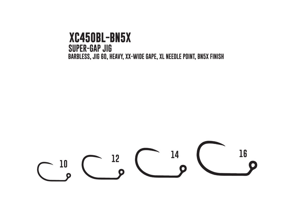 Similar in design to the XC400BL-BN, the XC450BL-BN gives tyers another carefully designed jig-style nymph hook with a deliberately super-wide gape to help make sure the hook point finds the fishes mouth no matter what you have tied on to the shank, making it a great option for small, jigged streamers as well. This hook pairs well with standard tungsten slotted beads, but it also works well with Umpqua’s Jig Bomb beads when you want to maximize the available shank length of your hook. The extended barbless needle point rides point up in the water to avoid snags and maintain sharpness. Combined with heavy wire and a stealthy black nickel finish, this hook gives anglers complete confidence when hooked up with large fish. Sold in packs of 25 hooks.