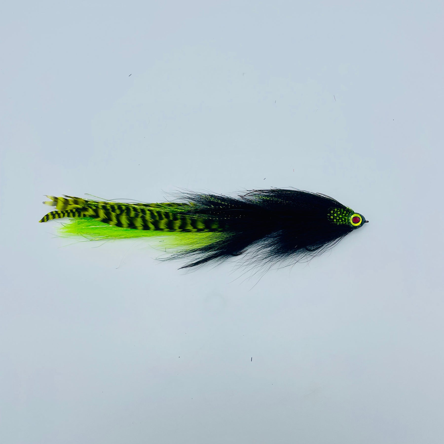 Double minnow musky fly. Tied on two Ahrex PR320 heavy gauge hooks with10mm eyes sealed in with Raid Zap UV cure for long term durability. Fishes as soon as it touches the water. Easily fishable with an intermediate through full sink line from high in the column to super deep. Great pattern for any predator fish.