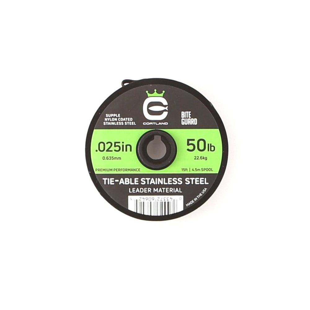 El acero inoxidable que se puede atar es un material líder de acero inoxidable de construcción 1x19, flexible y recubierto de nailon que se anuda fácilmente pero es lo suficientemente resistente como para resistir los dientes más afilados. El acero inoxidable atable de Cortland es para especies con dientes de todos los tamaños y formas, desde el lucio del norte y el almizclero hasta el pez azul.